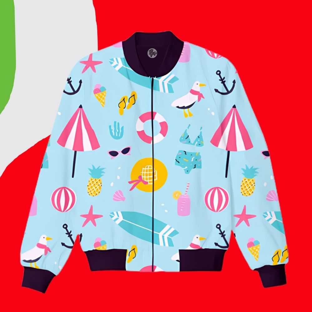 Stay stylish on the beach and beyond with the Beach Bum All Over Printed Bomber Jacket. Perfect for adding a touch of flair to any outfit, this jacket features a unique all-over print that is sure to turn heads. It's the perfect addition to your summertime wardrobe. Embrace your inner beach bum and stand out in style!