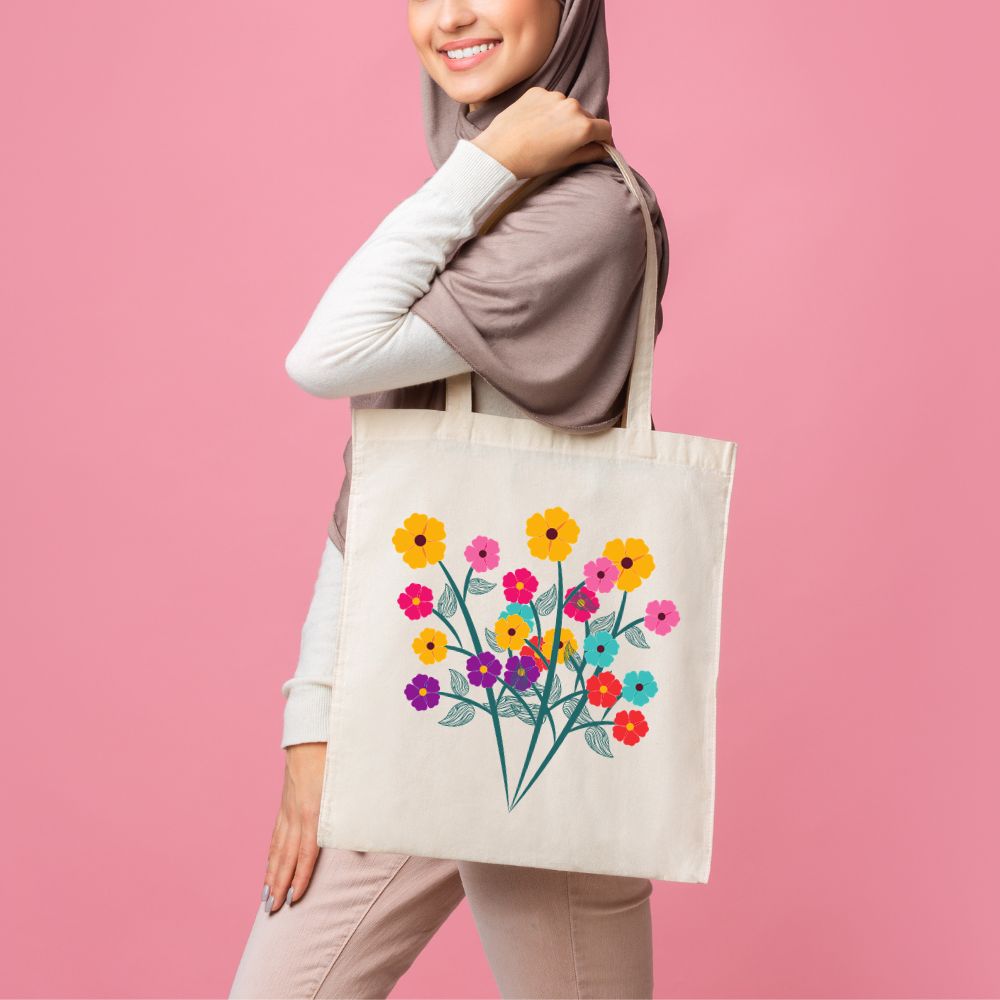 A cute, practical way to carry your stuff around with you! This whimsical tote bag is bright and cheerful, featuring a beautiful bunch of flowers and a zipper to keep your things safe and secure. Express yourself while adding a little floral flair to your wardrobe!