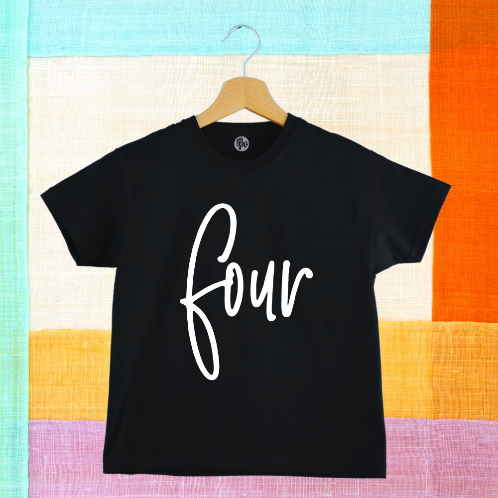 Celebrate your kiddo's big 4th birthday with this stylish and bold "Four" T-Shirt! Show off the numbers with a unique font and design, making it a great addition to any birthday party. Make it a birthday party they'll never forget!