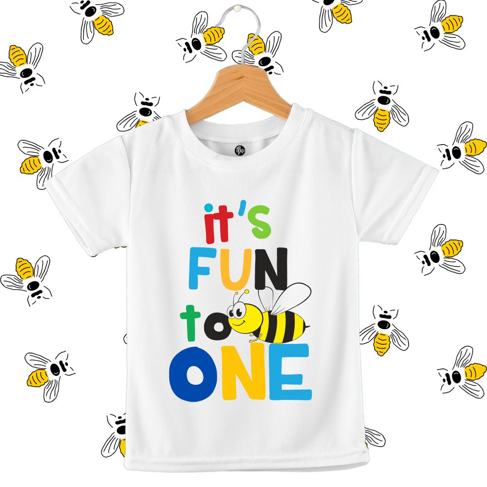 Celebrate your little one's birthday with this cute t-shirt! "It's Fun to be One" is printed with a cute honey-bee, so your cutie bee can show off their sting in style! Perfect for their first birthday and beyond!