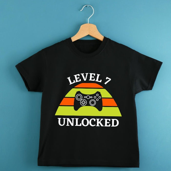 Celebrate turning seven with this fun "Level 7 Unlocked" birthday t-shirt designed just for kids! Its playful design makes it perfect for birthday parties and everyday wear, letting your little one proudly show off their special milestone. Soft and comfortable, it keeps active kids happy from morning until bedtime. A great way to add extra joy to the big day!