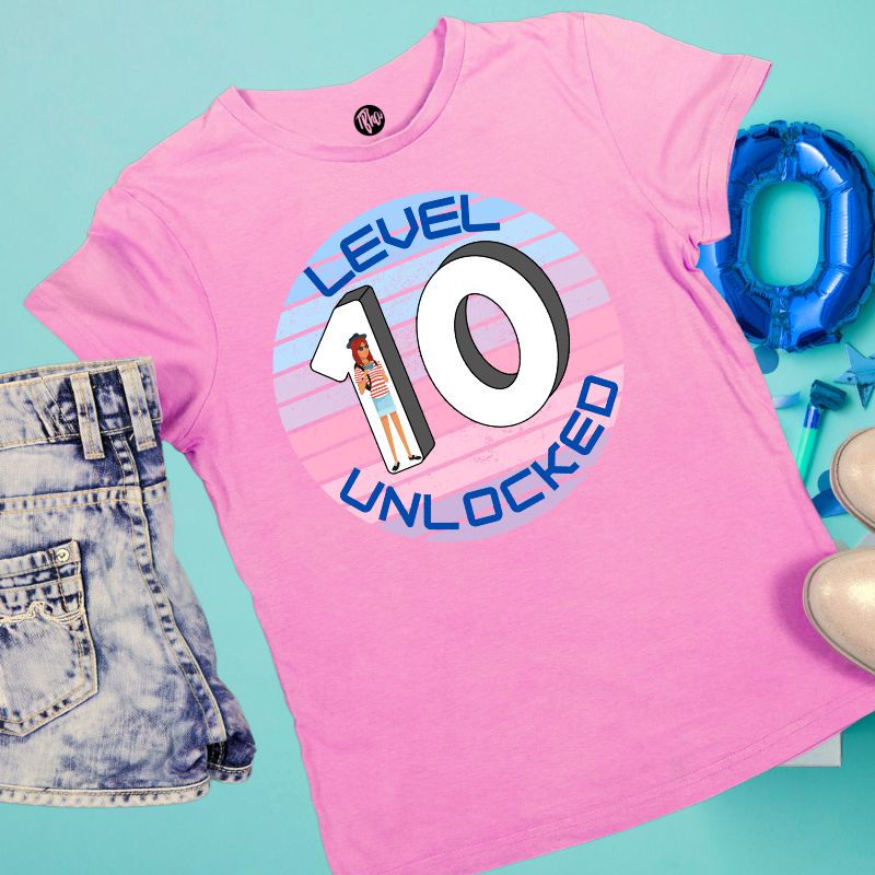 Level up in style! Our Level Ten Unlocked Tenth Birthday T-Shirt for Girls is the perfect trendy addition to your little one's birthday wardrobe. Featuring the cool "level unlocked" graphic, it's the perfect way to celebrate achieving double digits in style! Reach new heights in fashion with this one-of-a-kind outfit! 🎉