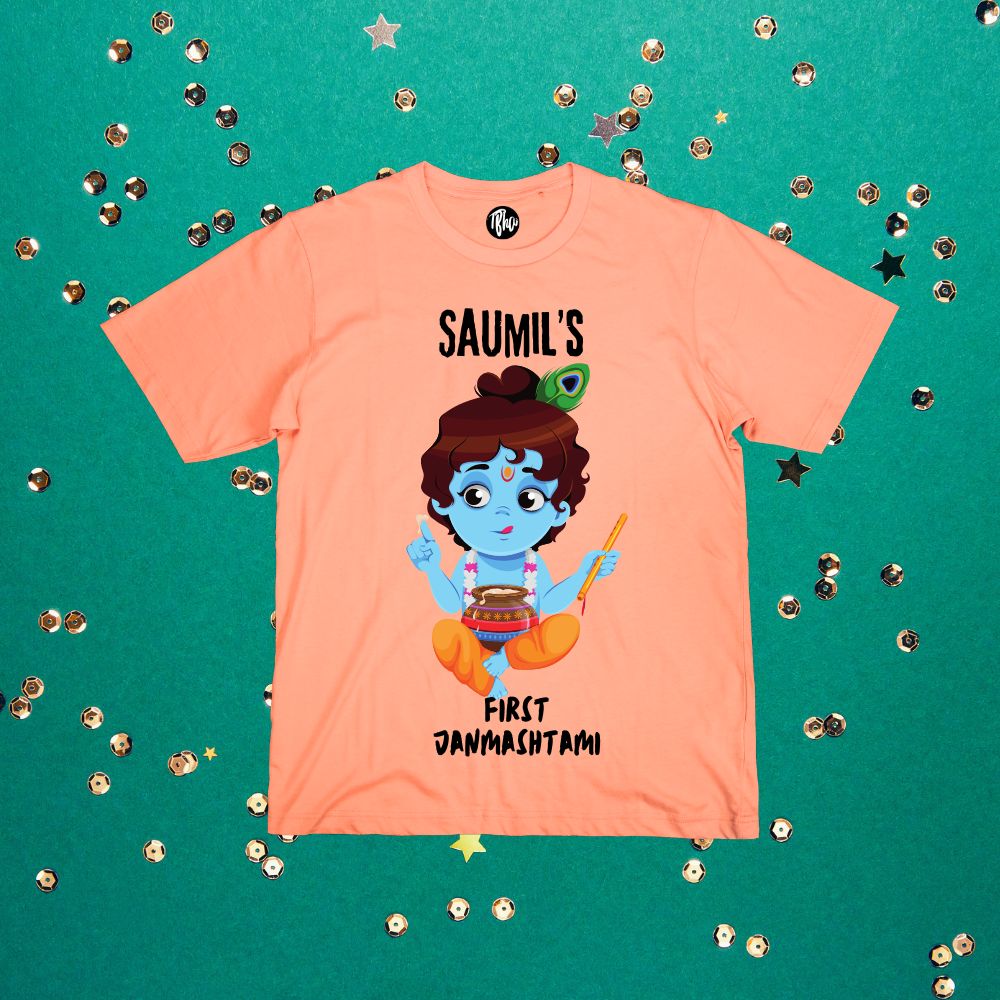 Let your little one celebrate Janmashtami in style with this adorably cute My First Janmashtami Customized T-Shirt! Crafted with super-soft fabric and sporting a Krishna image, this shirt is sure to be a hit with the kiddos! (And parents, too!)