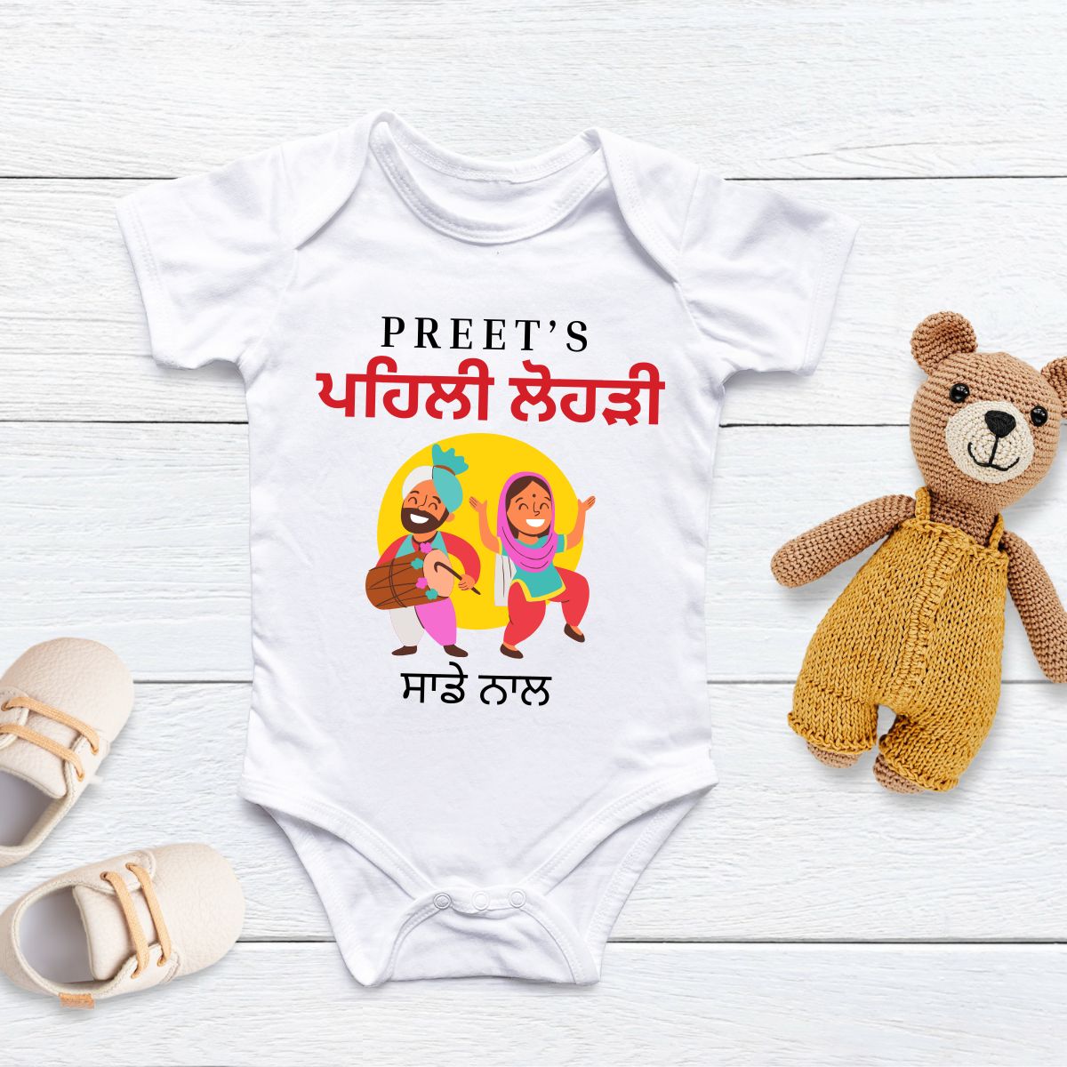 Celebrate your baby's first Lohri with a personalized onesie in traditional Punjabi text! Make this special occasion even more memorable with this unique and meaningful onesie. Perfect for keeping your little one cozy and stylish while honoring your cultural traditions.