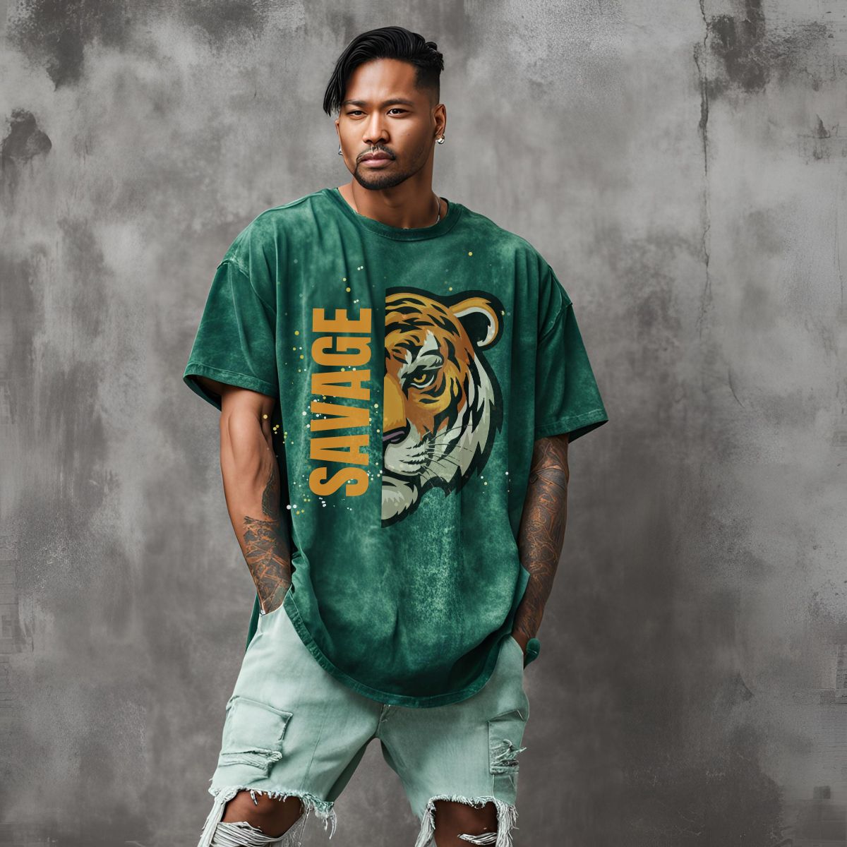 Slay with style in our Savage Bottle Green Acid Wash Oversize T-Shirt. Made with a fierce tiger print on a trendy acid wash background, this shirt exudes confidence and edginess. Stand out and make a statement with our bold and stylish shirt.