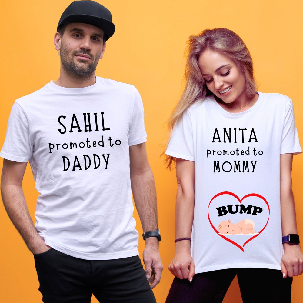 Promoted to Mommy & Promoted to Daddy Pregnancy Announcement T-Shirts with Name Personalization