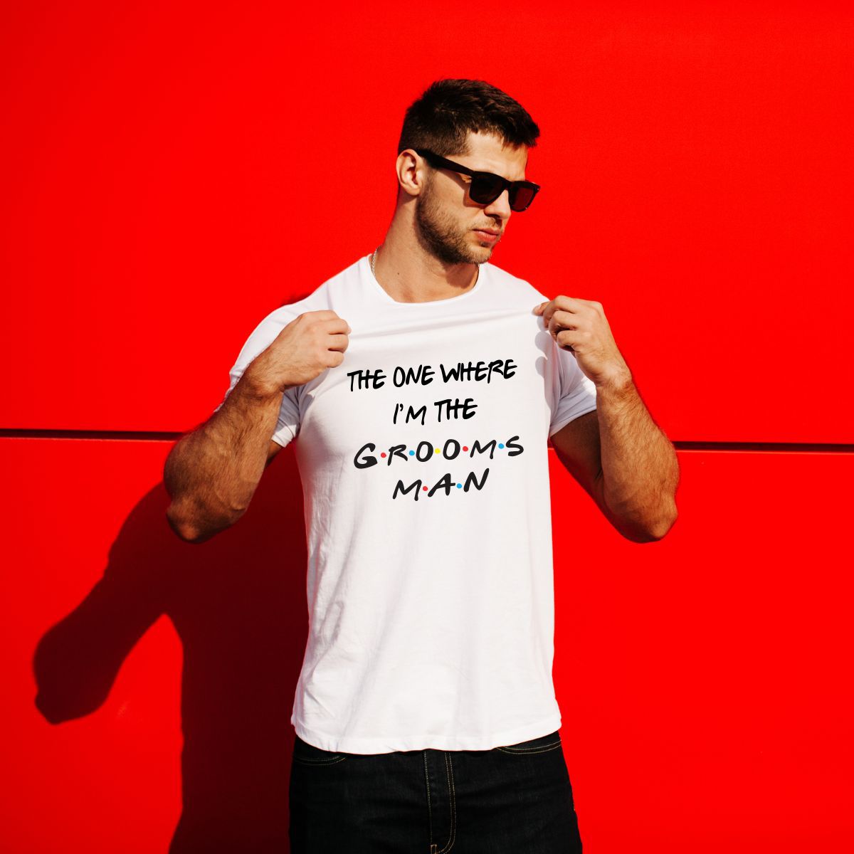 Be the ultimate best man with this Friends-themed t-shirt that proudly proclaims "The One Where I am the Groomsman"! Designed with the iconic Friends font, it's perfect for any Friends fan and will make a great gift for the groom. Show off your love for the show and your role in the wedding with this fun and stylish shirt!